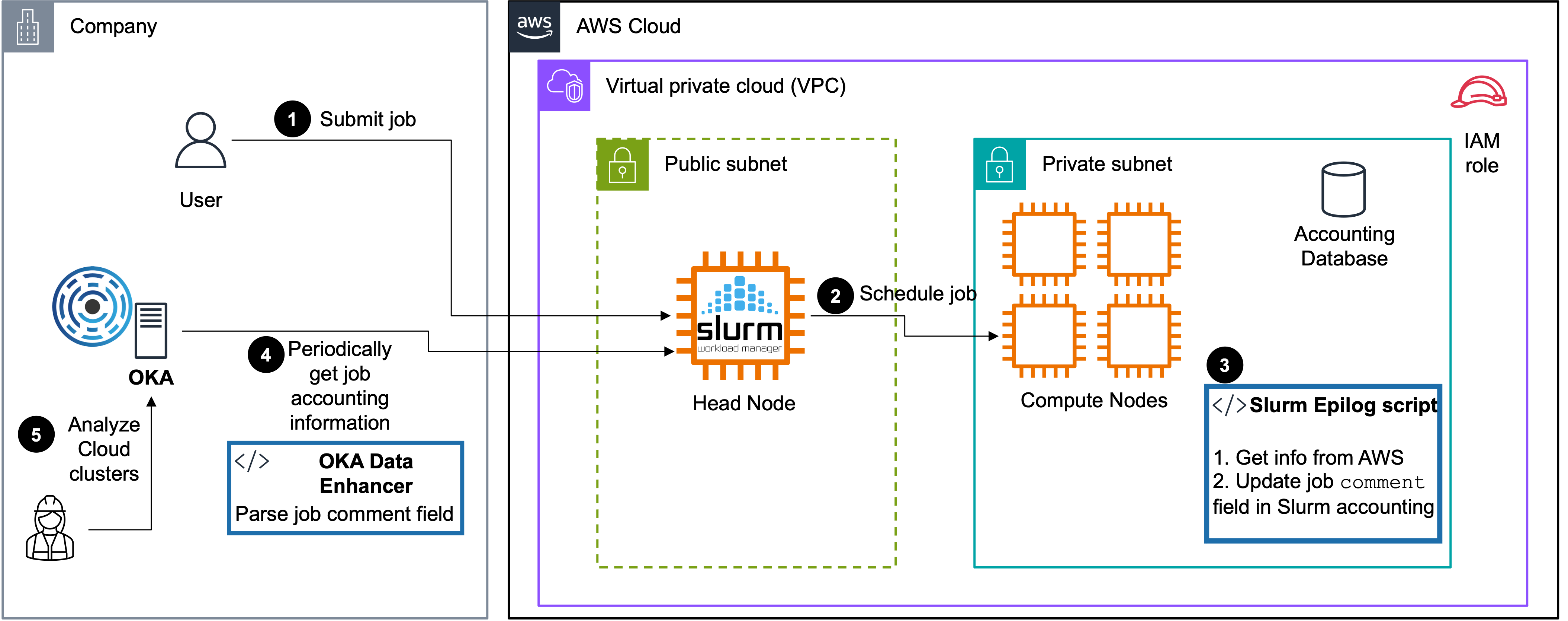 On top of the standard metrics gathered by Slurm, CCME configures a Slurm epilog script that will gather information about the AWS environment on which the jobs run, and store this information as comma separated values (CSV) in the Comment field of the jobs. The gathered information are: