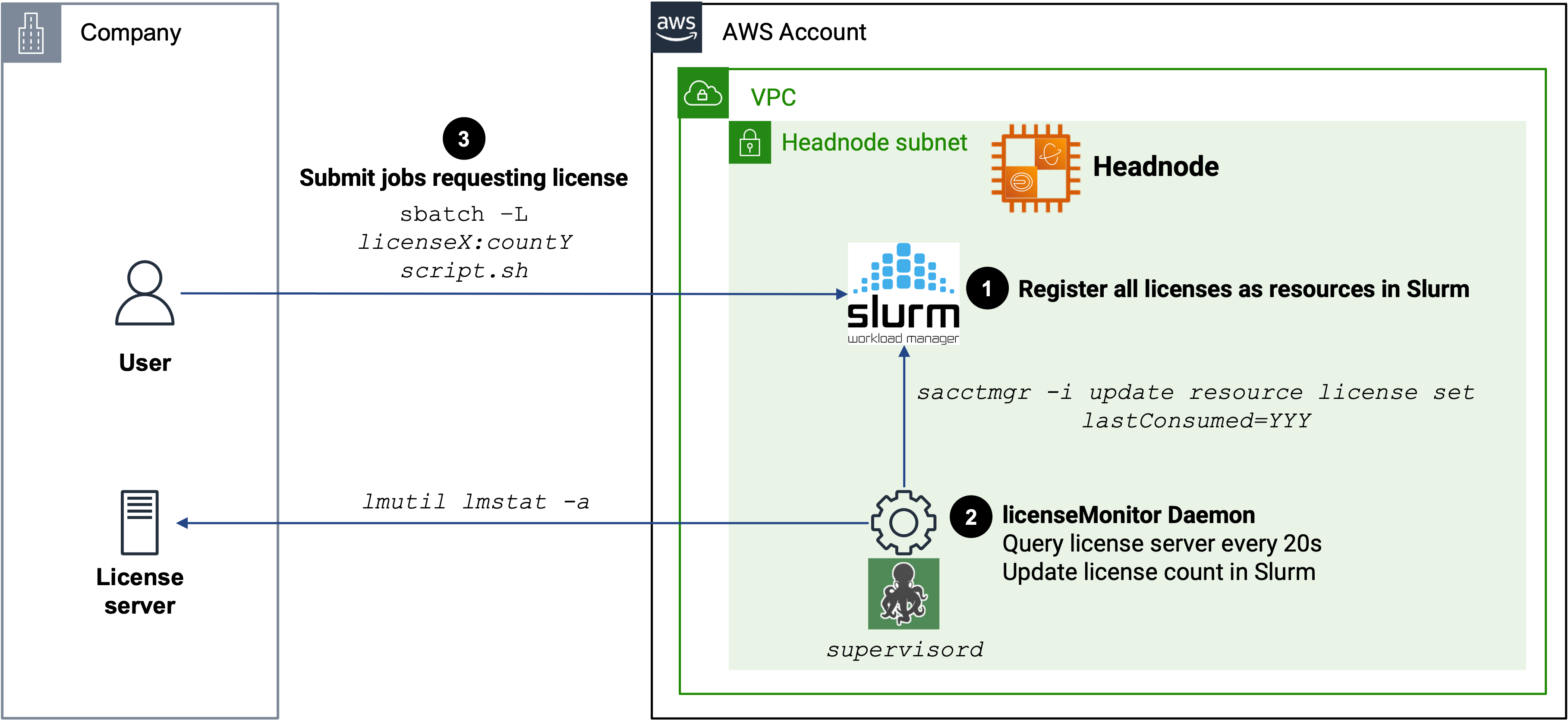 Slurm will ensures capacity will be provisioned only if there is at least 5 advanced_meshing2 licenses available on server 1056@myflexlmhost2.